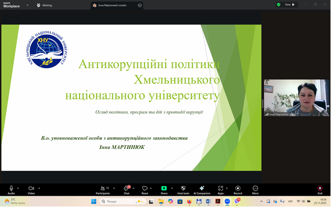 25 листопада 2025 року у Хмельницькому національному університеті відбувся вебінар для науково-педагогічних працівників на тему «Антикорупційне законодавство України та антикорупційна політика ХНУ».