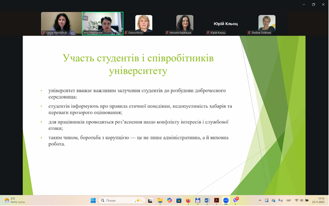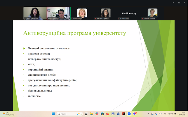 Під час заходу обговорювалися типові ризики, з якими можуть зіштовхнутися науково-педагогічні працівники у професійній діяльності, а також шляхи їх запобігання з урахуванням норм чинного законодавства та внутрішніх нормативних документів університету.