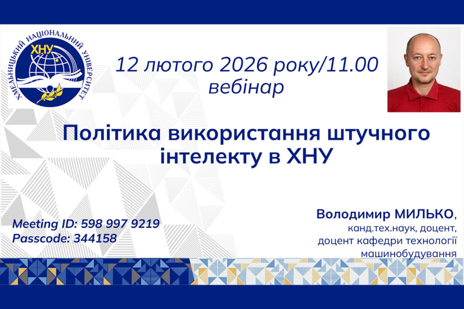 Стрімкий розвиток генеративних моделей штучного інтелекту (ChatGPT, Copilot, Gemini тощо) створює нові можливості для вдосконалення… Читати далі »Вебінар «Політика використання штучного інтелекту у ХНУ»