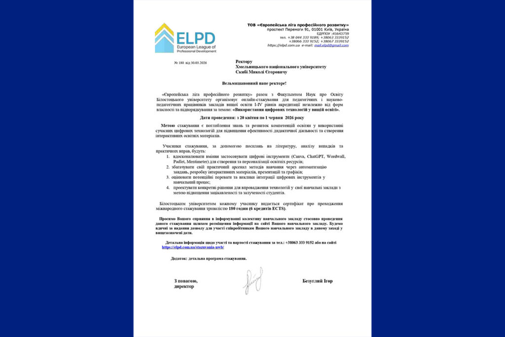 - Міжнародне онлайн-стажування «Використання цифрових технологій у вищій освіті»