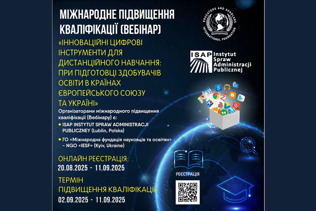 - МІЖНАРОДНЕ ПІДВИЩЕННЯ КВАЛІФІКАЦІЇ (ВЕБІНАР) НА ТЕМУ: «ІННОВАЦІЙНІ ЦИФРОВІ ІНСТРУМЕНТИ ДЛЯ ДИСТАНЦІЙНОГО НАВЧАННЯ: ПРИ ПІДГОТОВЦІ ЗДОБУВАЧІВ ОСВІТИ В КРАЇНАХ ЄВРОПЕЙСЬКОГО СОЮЗУ ТА УКРАЇНІ»