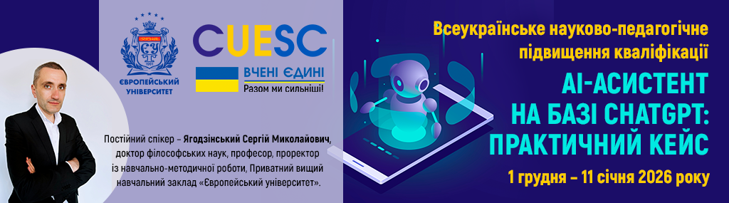 Приватний вищий навчальний заклад «Європейський університет», Центр українсько-європейського наукового співробітництва запрошують узяти участь у всеукраїнському науково-педагогічному підвищенні кваліфікації «АІ-асистент на базі ChatGPT: практичний кейс», яке відбудеться 1 грудня – 11 січня 2026 року.До участі в підвищенні кваліфікації запрошуються здобувачі закладів освіти, вчителі, молоді викладачі, наукові та науково-педагогічні працівники, завідувачі кафедр, декани, проректори з навчальної роботи, співробітники навчальних відділів університетів та всі охочі, які зацікавлені запропонованою тематикою.Кожен учасник підвищення кваліфікації отримає сертифікат та збірник тез науково-методичних доповідей в електронній формі.Навчальне навантаження становить 6 кредитів ECTS (180 годин) і розподіляється по 6 годин кожен день протягом 6 робочих тижнів.