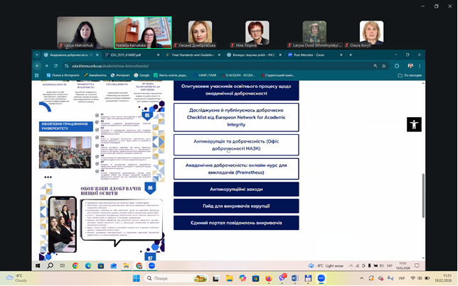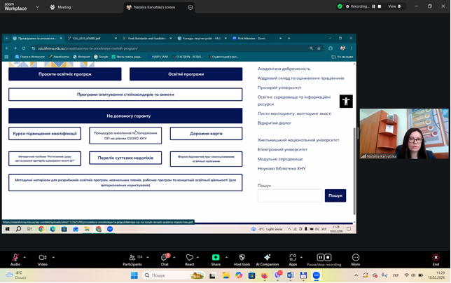 З метою поглиблення знань викладачів щодо функціонування внутрішньої системи забезпечення якості освіти в університеті, удосконалення механізмів моніторингу освітньої діяльності та узгодження процедур із вимогами законодавства України і стандартів вищої освіти 18.02.2026 Центром післядипломної освіти проведено вебінар на тему «Система внутрішнього забезпечення якості освітньої діяльності та якості вищої освіти ХНУ».