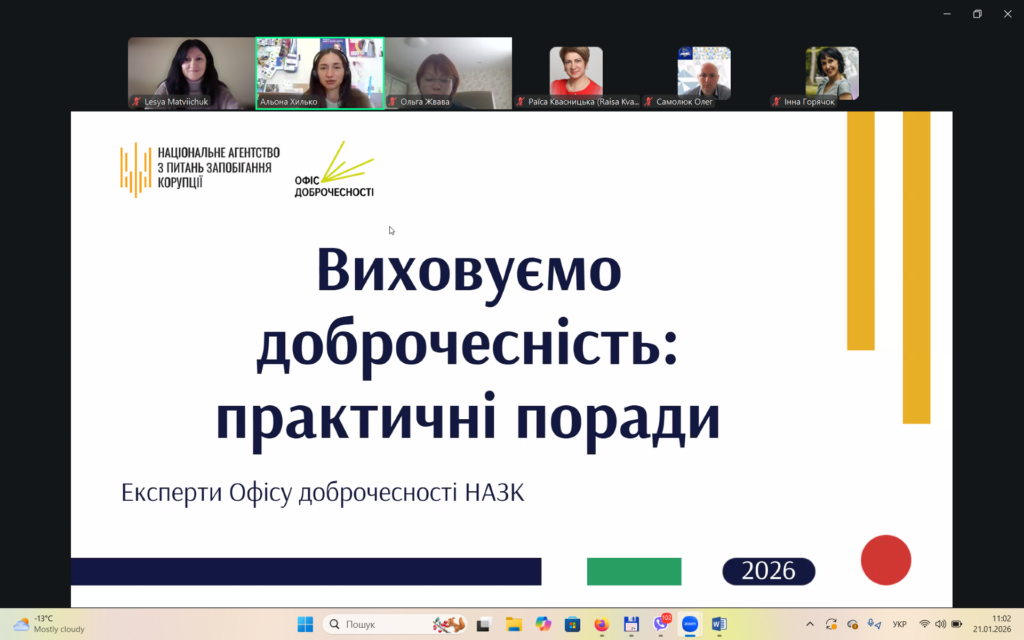 Метою семінару було підвищення обізнаності педагогів щодо питань доброчесності в освітньому процесі, запобігання корупційним проявам та формування етичних цінностей у здобувачів освіти.