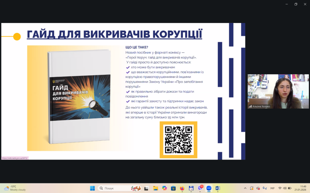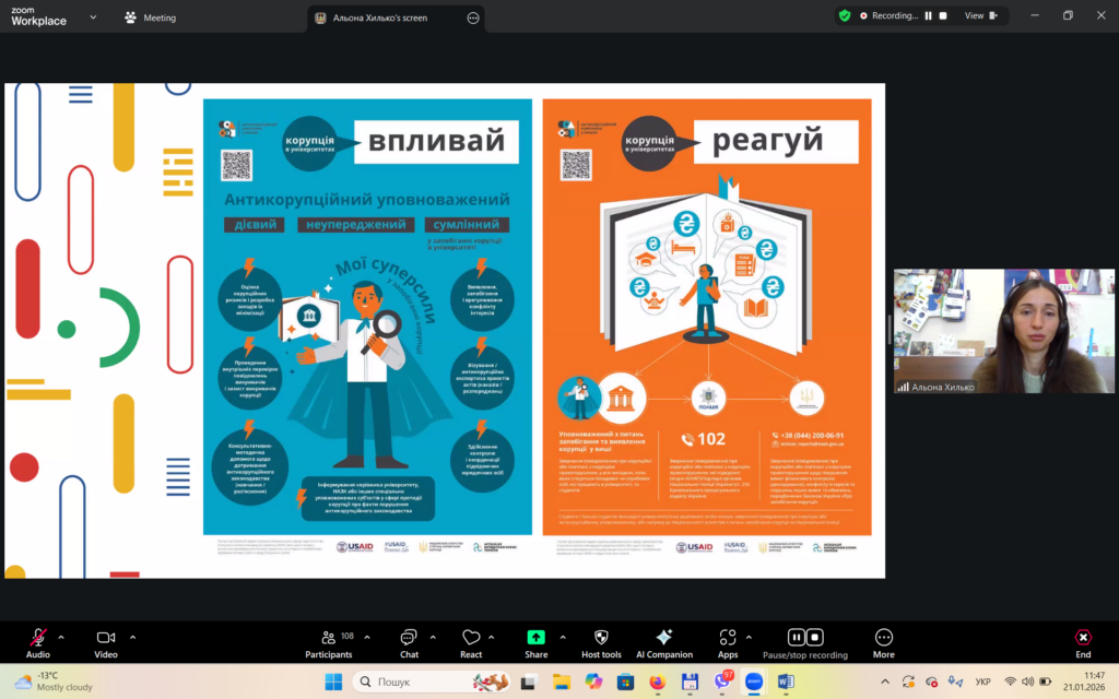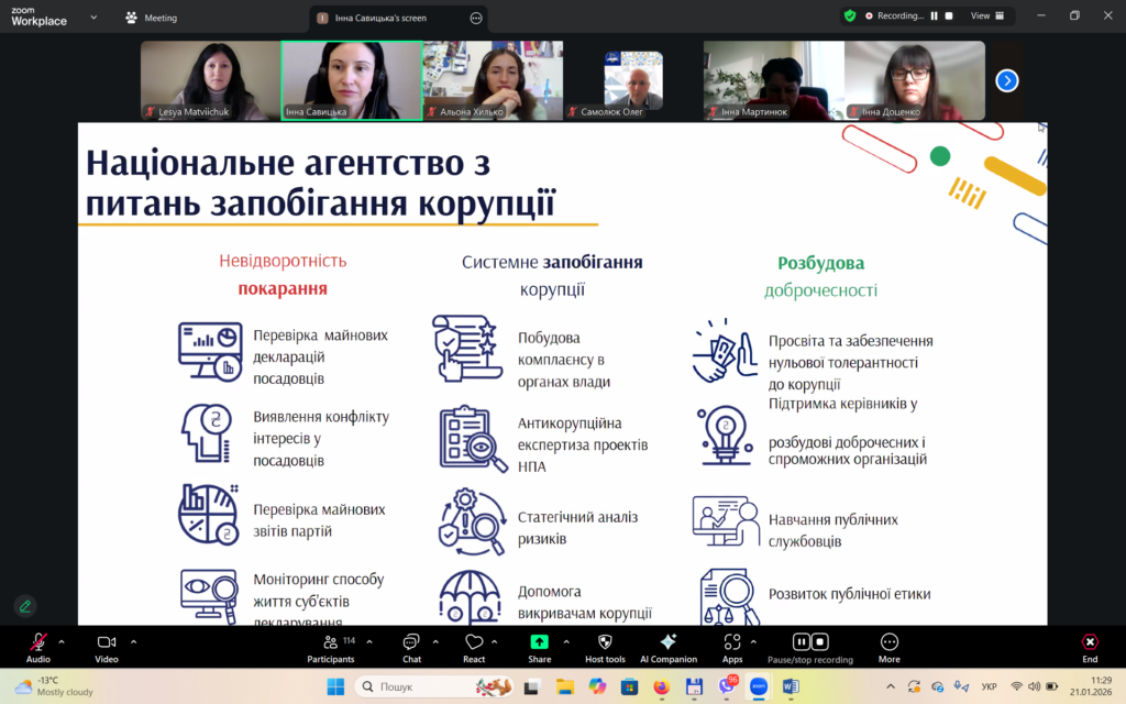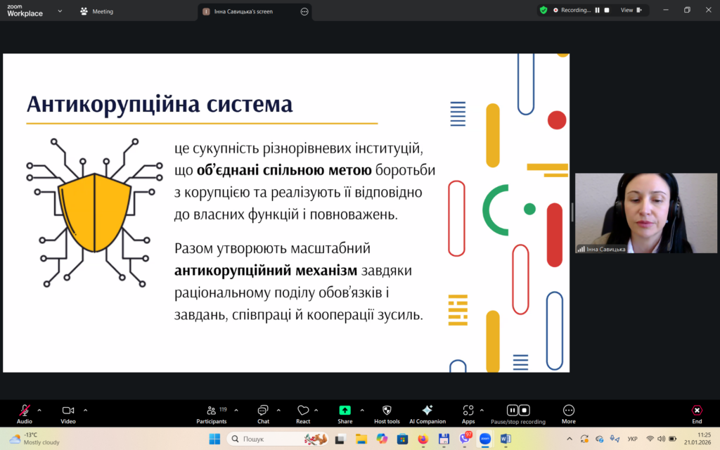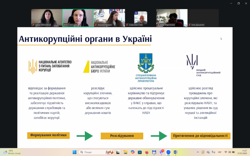 Спікерка детально охарактеризувала систему антикорупційних органів, їхні функції та повноваження, а також окреслила основні механізми запобігання корупції.