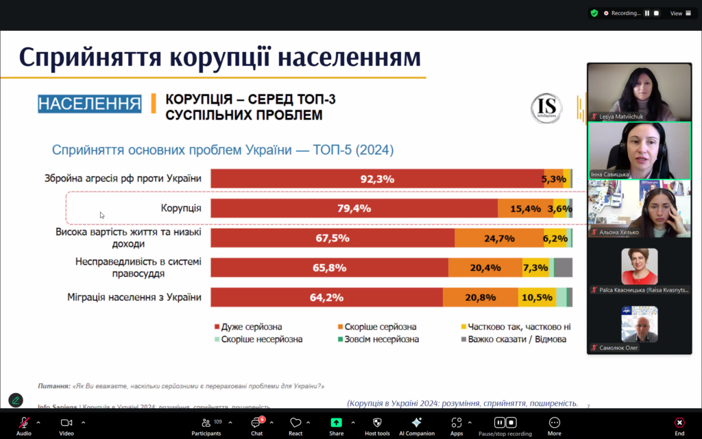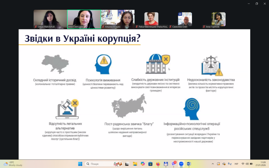 У першій частині вебінару Інна Савицька висвітлила проблему корупції та пов’язані із нею правопорушення.